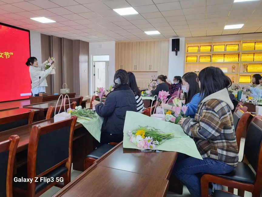 女职工们认真学习着插花艺术,享受着节日的喜悦和欢乐。