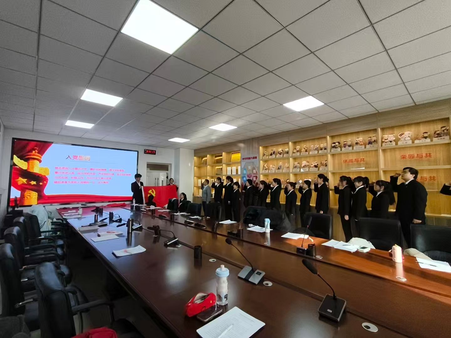 会议伊始,贾磊同志为新预备党员佩戴党徽。随后,在范炜同志的带领下,全体预备党员面向党旗庄严宣誓,铿锵誓言彰显了青年党员不忘初心、砥砺前行的坚定决心。