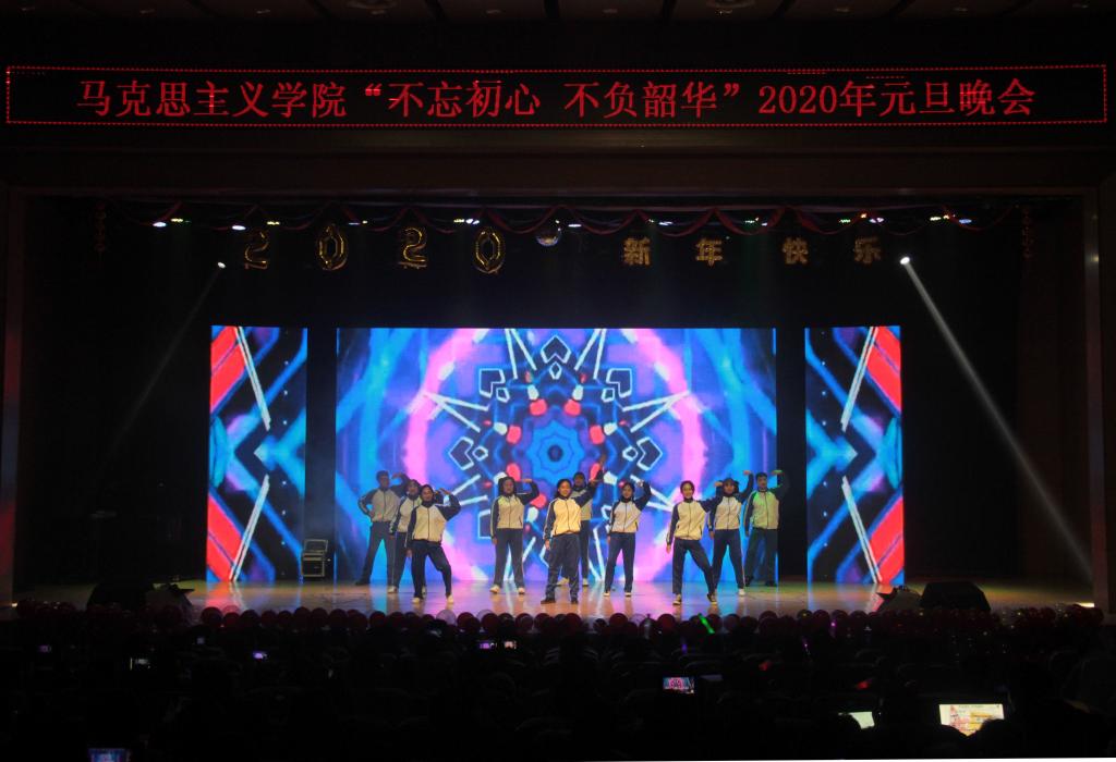 发展付出辛勤努力的老师和同学们表示衷心的感谢。刘玉明强调,“马院姓马、在马言马”,举行盛大的“不忘初心、不负韶华”元旦晚会,就是在传播马列主义思想,就是在坚定文化自信,为马院师生点赞,并向全体师生送上美好的新年祝福。紧接着,晚会在嗨翻全场的开场舞《Cherry bomb》拉开帷幕。本次元旦晚会共分为“不忘初心”、“不负韶华”两个篇章。