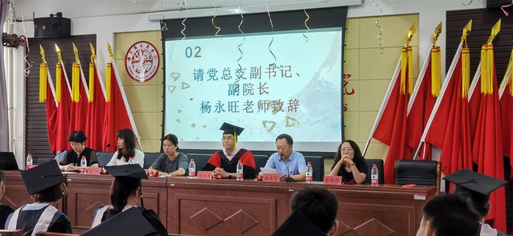 党总支副书记杨永旺致辞,杨书记向即将圆满毕业的莘莘学子送上最诚挚的祝福,向所有为学生成长倾注了热情和智慧的老师们表示衷心的感谢,同时寄语毕业生,希望他们走出校门后继续不断追求,勇于实践,一往无前,努力拼搏,无愧于社会,无愧于时代。母校永远是毕业生的家,愿时光温柔,待你如初,归来仍是少年。