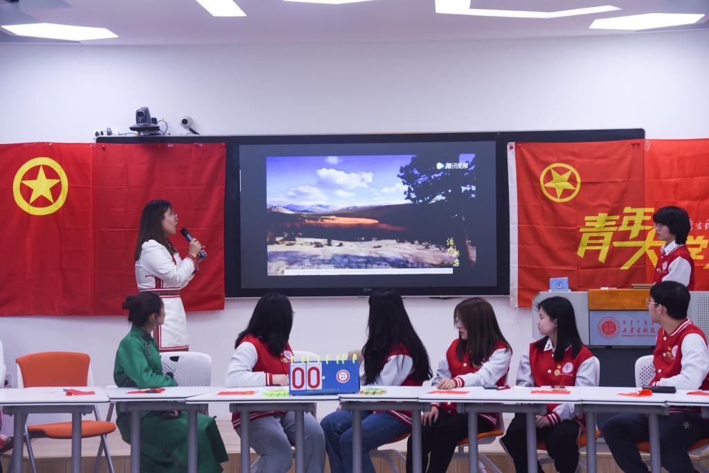 主题团日活动在激扬的团歌声中拉开帷幕,大家一齐唱响团歌。此次活动以家乡推介、朗诵、合唱、党史知识竞答、手写祝福等形式开展,内容生动,形式多样。活动中,同学们身着不同民族服饰,用多种表现形式介绍了自己的民族和家乡。有的同学用热情奔放的蒙古族歌舞表演传递着浓浓的草原气息;来自新疆库尔勒的同学,用短视频的方式介绍家乡,支持新疆棉花;有来自台州的同学用舞蹈展示着祖国海岸线的风土人情……从边疆到沿海,从东西到南北,共话中国情。
