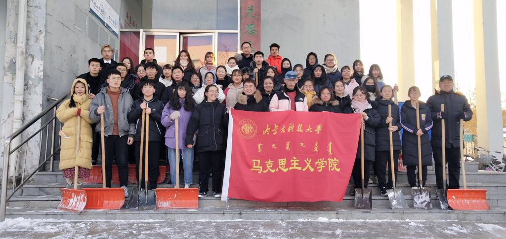 马院师生扫雪除冰的身影,为银装素裹的内科大增添了一道靓丽的风景线,给寒冷的冬日校园带来了不一样的温暖。