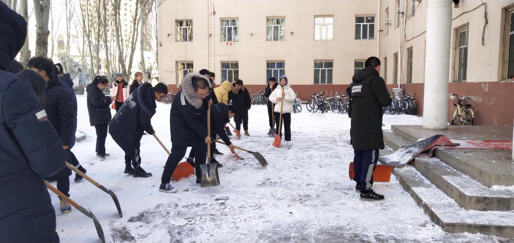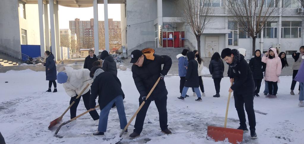 团总支、学生会全体成员,在王海朋老师的带领下,对校园内的积雪进行了及时清扫。虽然天气非常寒冷,但丝毫没有影响大家的劳动热情。同学们团结协作、干劲十足,用推雪板、铁锹、扫帚等工具,将图书馆、腾飞楼C座、女生宿舍1号楼等主要通道清扫干净,保障了师生顺利出行。