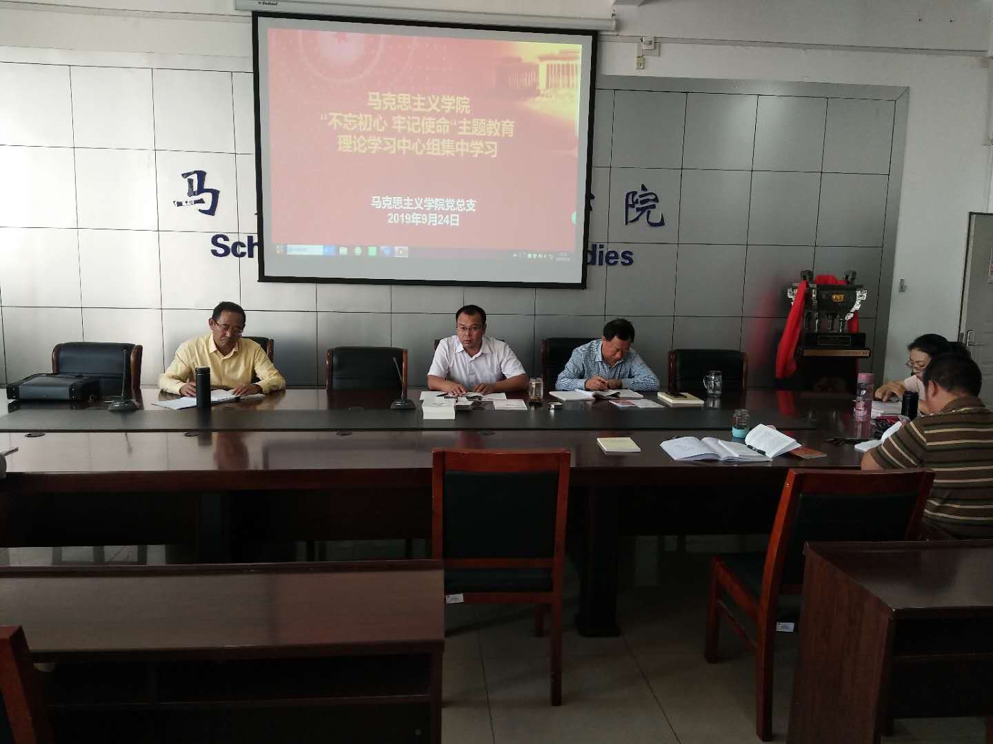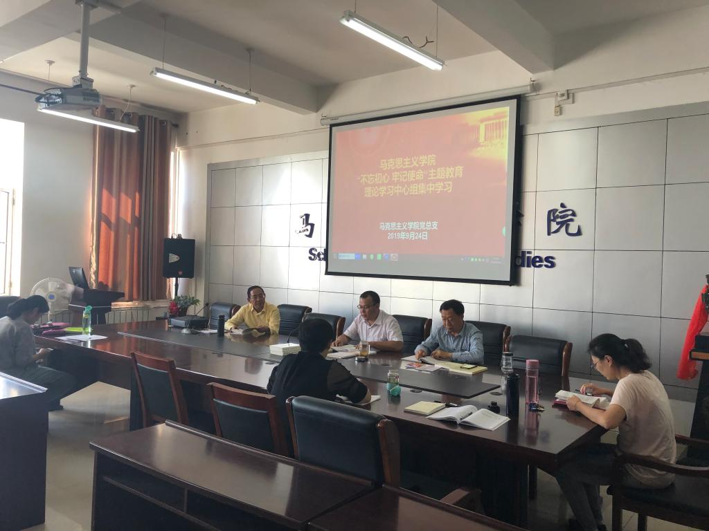 会议室开始封闭式集中学习。中心组通过读原文的方式,重点学习了《习近平关于“不忘初心、牢记使命”论述摘编》中的五章内容,其中党总支刘玉明书记领学了“加强学习、深入开展调查研究,全面增强执政本领”相关内容;副院长许丽丽领学了“坚持以人民为中心,把群众观点和群众路线深深植根于思想中、具体落实到行动上”相关内容;党总支副书记杨永旺领学了“坚决整治形式主义、官僚主义,加强真抓实干的作风建设”相关内容;教授委员会委员雎密太领学了“把政治建设摆在首位,不断增强‘四个意识’、坚定‘四个自信’、做到‘两个维护’”相关内容;教授委员会委员刘佳领学了“新时代要有新气象,更要有新作为”相关内容。