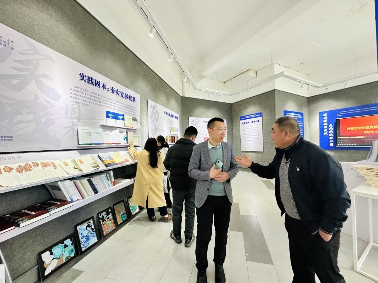 研学人员一行观看了“理论铸魂固根脉 实践赋能耀北疆”为主题的宣传教育纪录片,参观了理论研究成果展区、理论指导实践成果展区、文创成果展区、数字成果展区等,特别关注到我校铸牢中华民族共同体意识研究领域的代表性成果,在研学中不断凝聚共识,研讨中继续开拓思路。